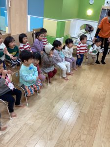 まずは3月生まれのお友だちの誕生会の様子です。今月のお誕生日のお友だちは2人います。これで、全員が誕生日を迎えることができました。