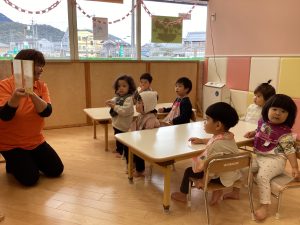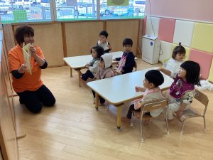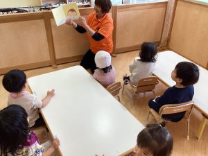 こんにちは😃サンライズキッズ保育園野洲園です。今週はりんご🍎組の絵本の読み聞かせの様子をお伝えします。