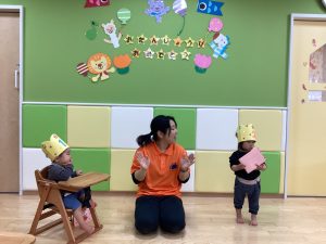 まずは誕生会です。もも組のお友だちといちご組のお友だちが誕生日を迎えました🎉お誕生日おめでとう🎊これからも元気いっぱい大きくなってね。みんなからお祝いしてもらい、冠と誕生日カードをもらいました😊
