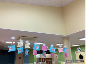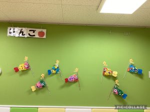 最後に、こいのぼりの製作が完成し、室内で可愛いこいのぼり🎏がたくさん飾られています。