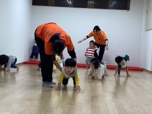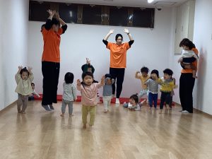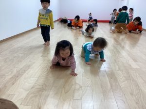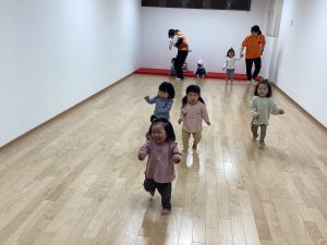 次は体操カリキュラムの様子です。サンライズでは、毎週水曜は体操のカリキュラムをして、身体をたくさん動かしています。ーいちご🍓組さんとりんご🍎組さんが空き部屋で体操のカリキュラムを行いました。