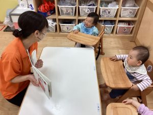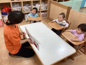 こんにちは、サンライズキッズ保育園野洲園です。今回はもも組さんの絵本の様子をお伝えします。