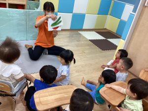 野菜のフラッシュカードを見ています。先生がめくるスピードについてこれるかな😊