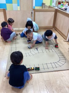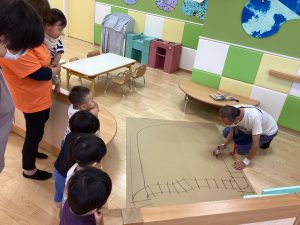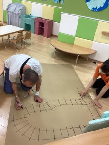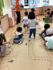 最近、朝の自由遊びや夕方の時間に電車のおもちゃで遊ぶことが多く、先生が段ボールで線路を描いていると、保護者の方が手伝ってくださいました。