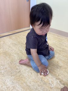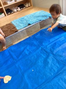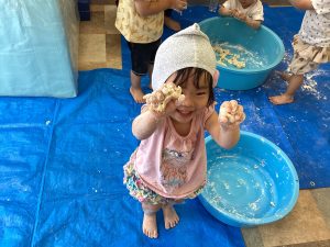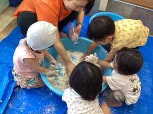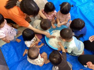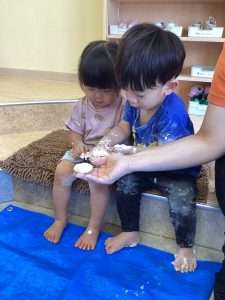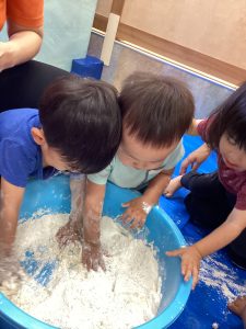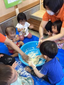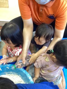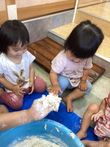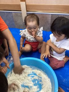 次はりんご組さんです。先生が小麦粉をタライの中に入れるとすぐに、感触を楽しんでいました😊