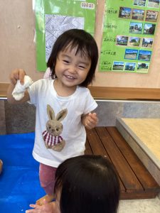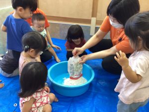 ちょっとずつ水を足していくよ〜。「見て〜いっぱい手についたよ〜😊」