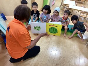 最後は真っ赤な美味しいスイカをみんなも食べた〜いと絵本に近づく姿も見られました。