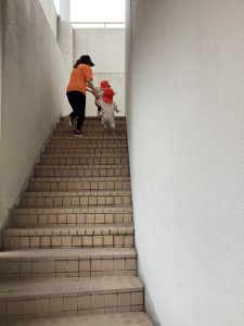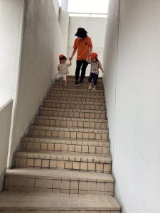 園近くをみんなで散歩した後、りんご🍎組さんは隣の丸善さんの階段を登り降りしました。昨年度も行いましたが、今年度も水害訓練があり高台に上がるための練習をしました。