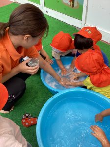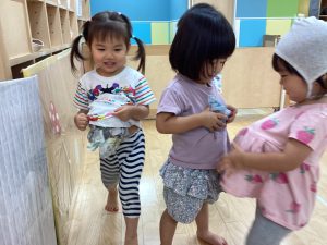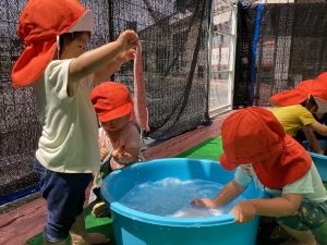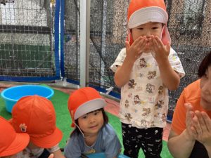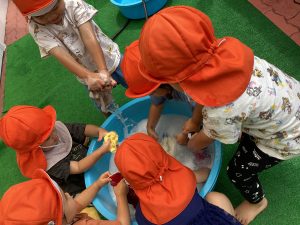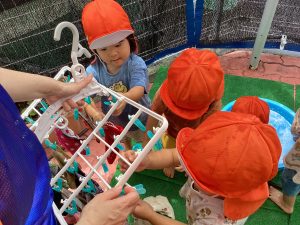 こんにちは、サンライズキッズ保育園野洲園です。今週は雨☔️の日が多く、水遊びができない日もありました。来週ぐらいには梅雨明けするかな🙂熱中症警戒アラートが出ている時は水遊びはできませんが、感触遊びなどを取り入れながら楽しく過ごしていきたいと思います。