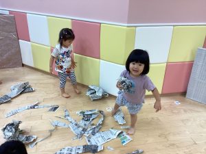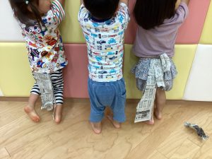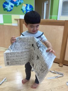 新聞遊びも子どもたちの発想でいろんな遊び方が出来ますね。また、お家でも新聞遊びを楽しんでみてください😊