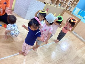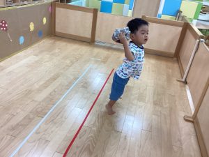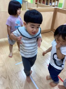 そこで、ビニールテープを床に貼り、その上をみんなで歩きました😆線の上を歩く時はみんな慎重にゆっくり歩いていました。