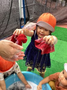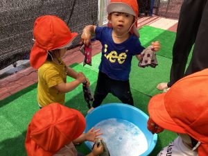 泡の感触を楽しんだ後、洗濯遊びをしました。タオルハンカチを洗ったよ!