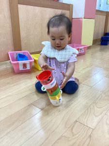 もも🍑組のお友だちが登園後、コップを上手に積んで遊んでいました😆