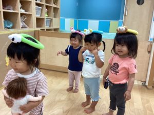 いちご🍓組のお友だちはどうぶつの輪投げを頭に乗せていました(笑)。『どう?頭に乗せても落ちないよ!』