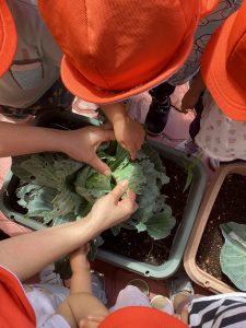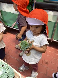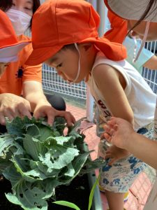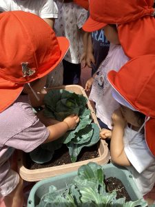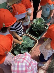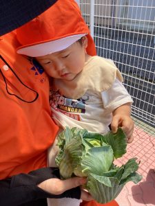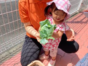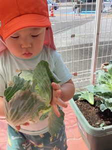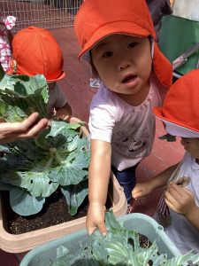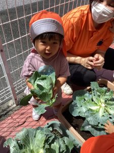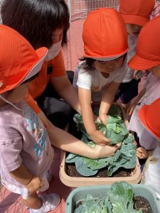 プランターで育てていたキャベツが大きくなってきたので、りんご🍎組さん、いちご🍓組さんと一緒に収穫をしましたよ。