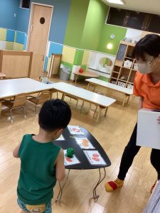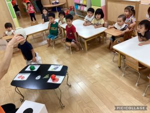 最後の♪グッバイソング♪を歌い終わった後、りんご🍎組さんを中心に果物ゲームをしました!果物のカードを机の上に並べておき、先生が持っているBoxの中から一つ選び、選んだ果物を同じカードの所に置いてもらいました😊果物の発音もみんなでしましたよ😊