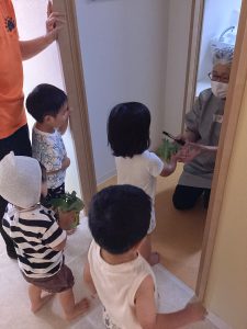 りんご🍎組さんが収穫したキャベツを給食の先生に持っていきました。
