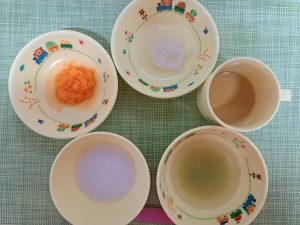 (写真は離乳食後期です。年齢によって形、固さ、盛り付け量を変えて、提供しています。)