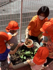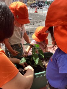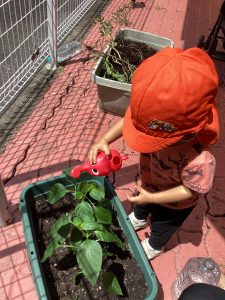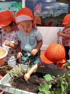 「ピーマンに土のお布団かけてくれるかな?」と伝えると優しく土をかけていました😊