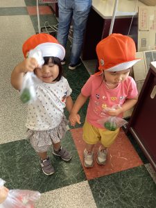 『園長先生、ただいま〜😊』みんな嬉しそうに、園長先生にピーマンとパプリカを見せていました😊