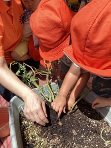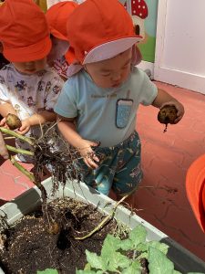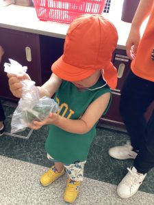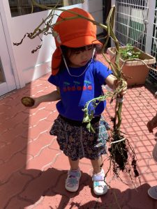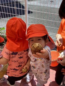 最後は給食の先生の所にじゃがいもを持って行きました。「いっぱい採れたよー」と言えました。給食の先生も「これなあに?」と質問し、みんなで『じゃがいも』と答えていました😊
