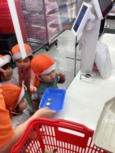 『では、お金を払いにレジに並びますよ』この時もお友だちと手を繋いでしっかり順番に並んでレジを待っていました。
