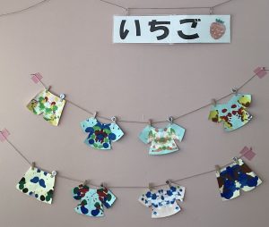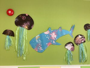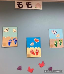 そして、みんながたくさんスタンプをしてできた作品がこちらです!何かわかりますか?😊クラゲとジンベイザメです!りんご組保育室に飾っています😊