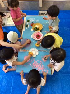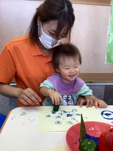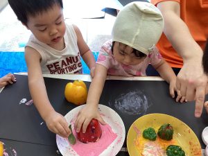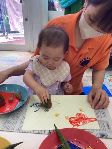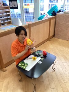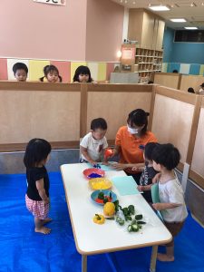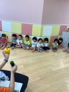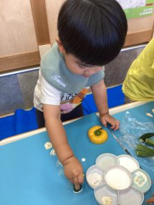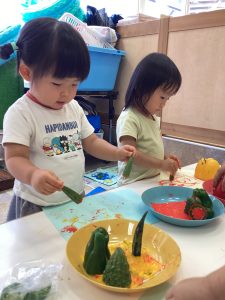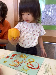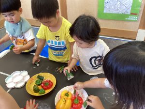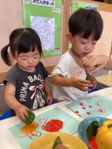 さて、今週のブログは野菜スタンプの様子をお伝えします。ピーマンとパプリカはりんご組さんが隣の丸善さんへ行き、買ってきてくれたものです😊