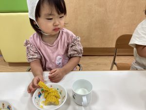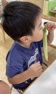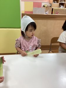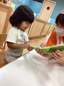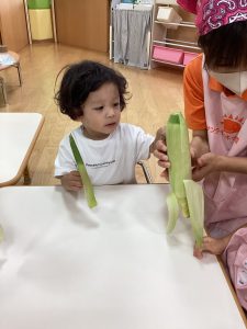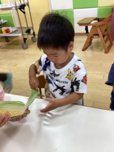 最後にりんご組さんの食育活動の様子をお伝えします。とうもろこし🌽の皮剥きのお手伝いをしてくれました😊