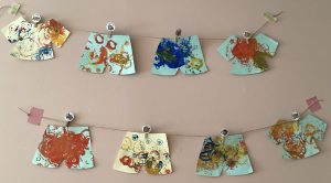 ズボンとTシャツを作りました。一つはデカルコマニーという技法で作り、もう一つは野菜スタンプで作りました。