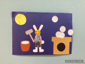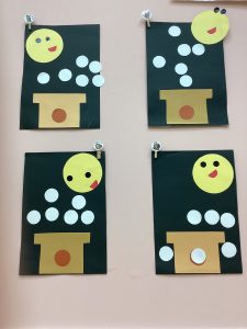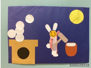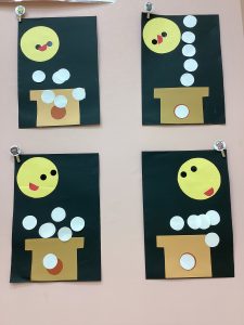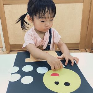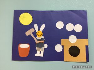 お団子を好きなところに貼ったり、お月様の目と口のパーツを貼りました。