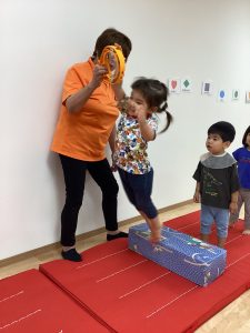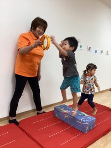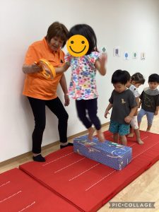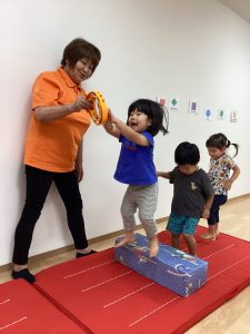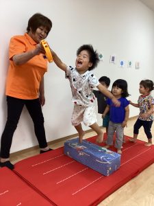 朝の自由遊びの時間に、りんご🍎組さんは園長先生と一緒に空き部屋に行き、運動遊びを楽しみました。