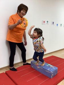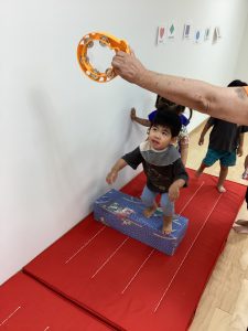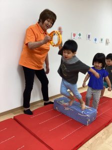 台の上に乗り、ジャンプをしてタンバリンを鳴らせるかな?😆タンバリンをよく見て、せーの!ジャーンプ!