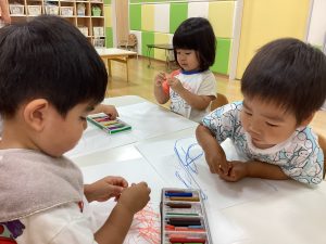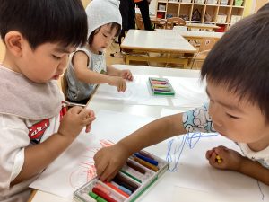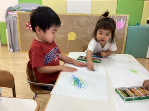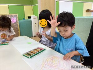 何をしているのかな?😊クレヨンでお絵描きをしています。