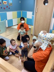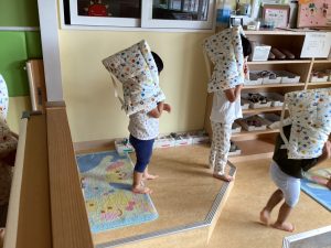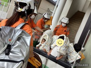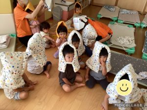防災頭巾は初めて訓練を行った時はすぐに頭巾を取ってしまうお友だちもいましたが、繰り返し、頭を守るために防災頭巾を被ることは大事だと伝えることで、しっかり被れるようになりました!