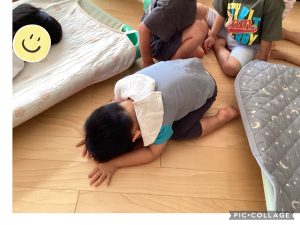 「地震でお部屋が揺れているよ」と知らせると、りんご組のお友だちはすぐにお尻を向け、ひじとひざ、足の甲を床につけて手で頭を守るポーズをしていました。これは、『ダンゴムシのポーズ』で、地震の避難訓練をした時に子どもたちに伝えているポーズです😊ちゃんと覚えていてすぐに行動にうつせていました😆