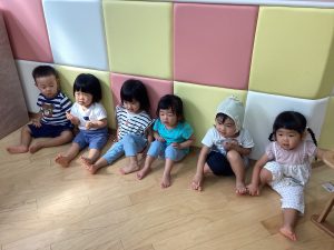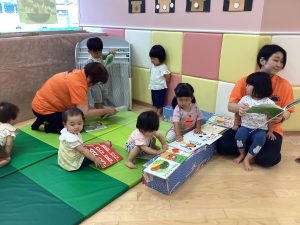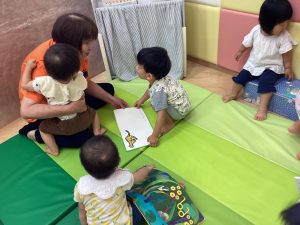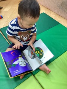 保育室にマットを敷き、絵本コーナーを作りました。自由に見られるように絵本を並べました。どれにしようかな?😊と自分で好きな絵本を選んでいました。