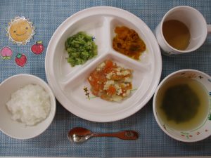 (写真は離乳食後期です。年齢によって盛り付け量を変えて、提供しています。)