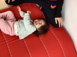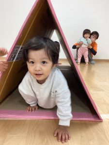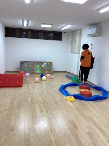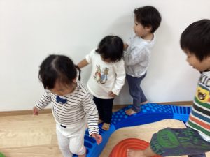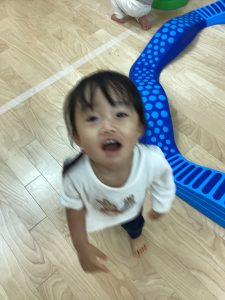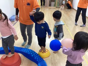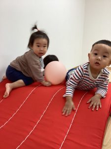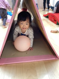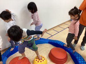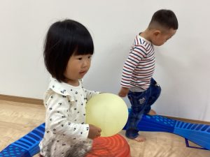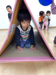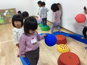 バランス平均台の上を歩いたり、マットの山やトンネル潜りをしたよ。