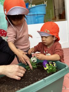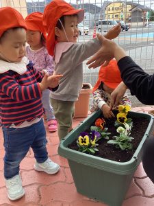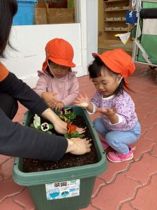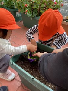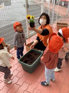 もも組さん、いちご組さんと一緒にパンジーを植えました。