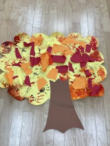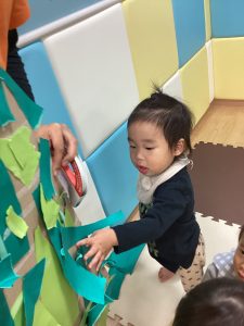 さて、新聞だけでなく、画用紙もビリビリしたら、木に貼ってみよう。