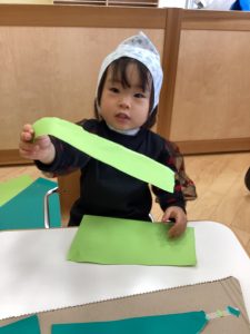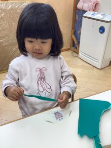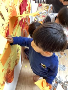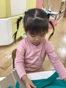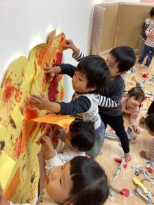 千切った画用紙を段ボールに貼っています。いっぱい貼ってね😊