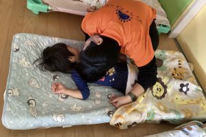 年3回(5月、8月、11月)、訓練を行なっています。毎日の午睡時には、職員が子どもたちの呼吸や熱がないかなど、5分に1回、身体に触れながらチェックを行なっています。AEDの使い方も、もしもの時に使えるよう確認しながらやっています😊※このAEDは本の付録に付いていたものを組み立てて作りました。