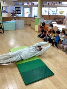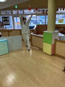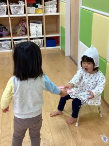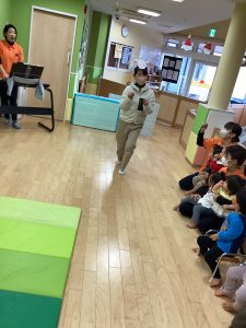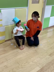 歌の後は利用者さんたちと握手したり、♪やきいもグーチーパー♪、♪まつぼっくり♪の手遊びを利用者さんたちと一緒に楽しみました。
