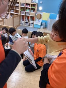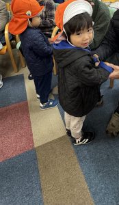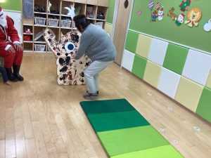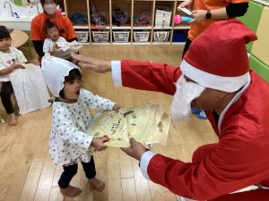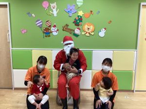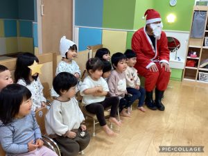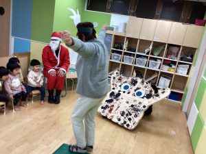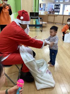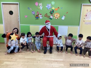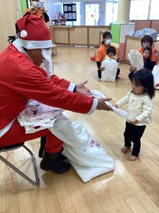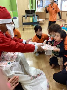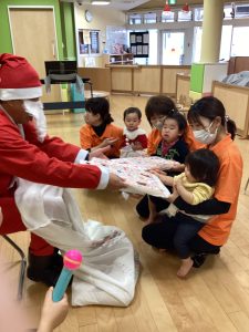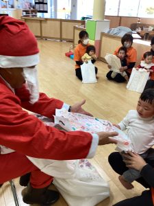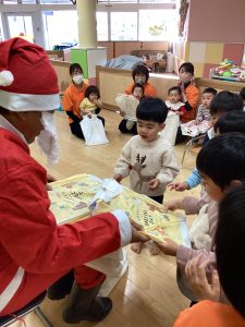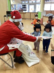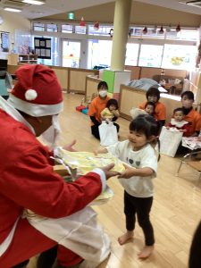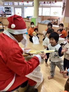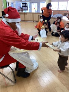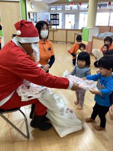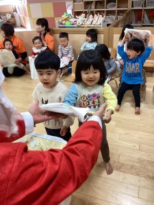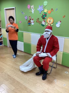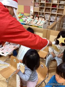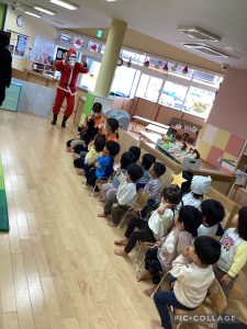 先生が、『サンタさんが持っている白い大きな袋には何が入っているんですか?』とサンタさんに聞くと『みんなからのプレゼント🎁を持って来たよ』と教えてくれました😄やったー!