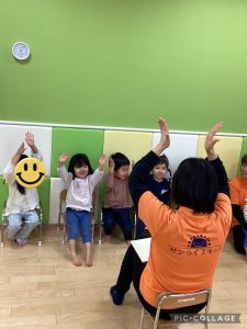 読み合いの前にみんなで手遊びをしたよ。『こぶたがみちを』の手遊びが大好きなりんご組さんです😃