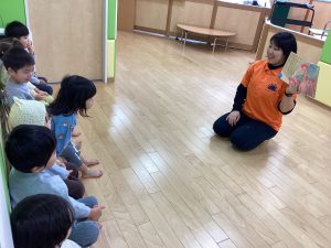 「みんなであそぶひ」の絵本を読み合いしました。ボール遊びが大好きなリスくんが遊んでいると、うさぎさんやぶたさんたちもやって来て、広場で何をして遊ぶか相談してみんなで楽しく遊ぶお話です。