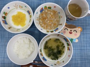 今日は定番メニューの野菜入り鶏そぼろ丼でした。食べ慣れている食事をすることも大切な食育の一つです。安心して食べられ、そしてどんな料理であるかも認識していきます♪
