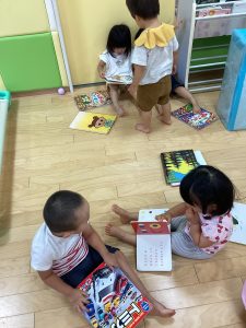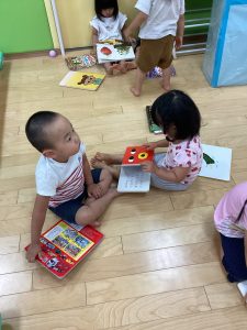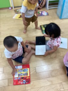 子どもたち同士関わり合いながら絵本を読み合う姿も見られます❤️