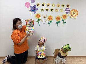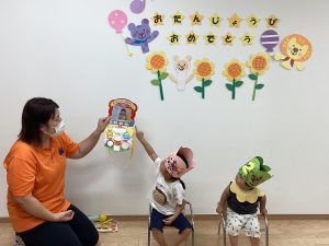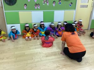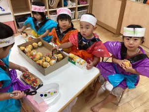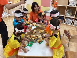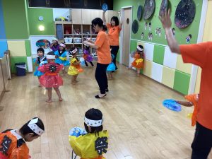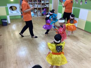 誕生日会でつくったうちわをもって盆踊りをしたよ♪